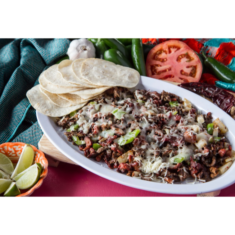 carnes asadas al carbón , pimientos y queso Oaxaca , acompañado de 2 tortillas de harina y 4 tortillas de maíz hechas a mano.