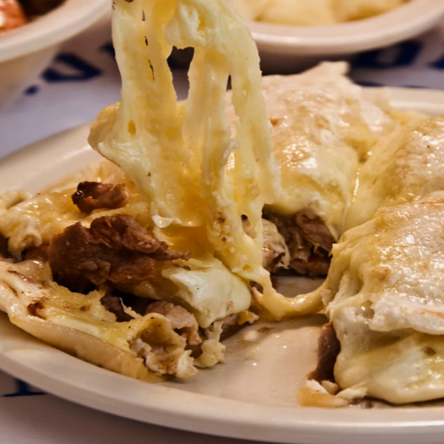 tortilla grande de harina rellena de chorizo casero y cuatro quesos gratinados.