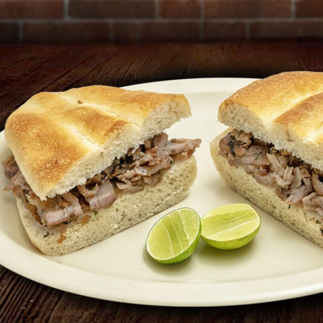 Telera del dia con mayonesa y frijol acompañado de Chuleta Asada al Carbon, cilantro y cebolla.