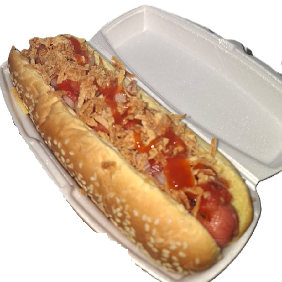 Salchicha y pan jumbo, mayonesa, catsup, tomate, cebolla y papas paja