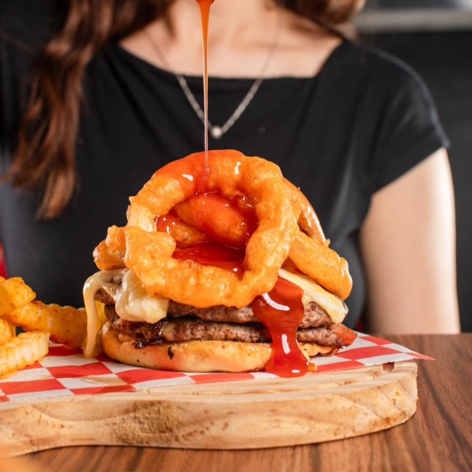 DOBLE CARNE ANGUS DE 120 GRS CADA UNA, QUESO 120 GRS, DOBLE TOCINO 100GRS, 5 AROS DE CEBOLLA, SALSA BBQ CHIPOTLE ACOMPAÑADA DE 150 GRS DE PAPAS A LA FRANCESA CON MIX DE PAPRIKA