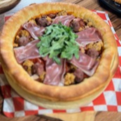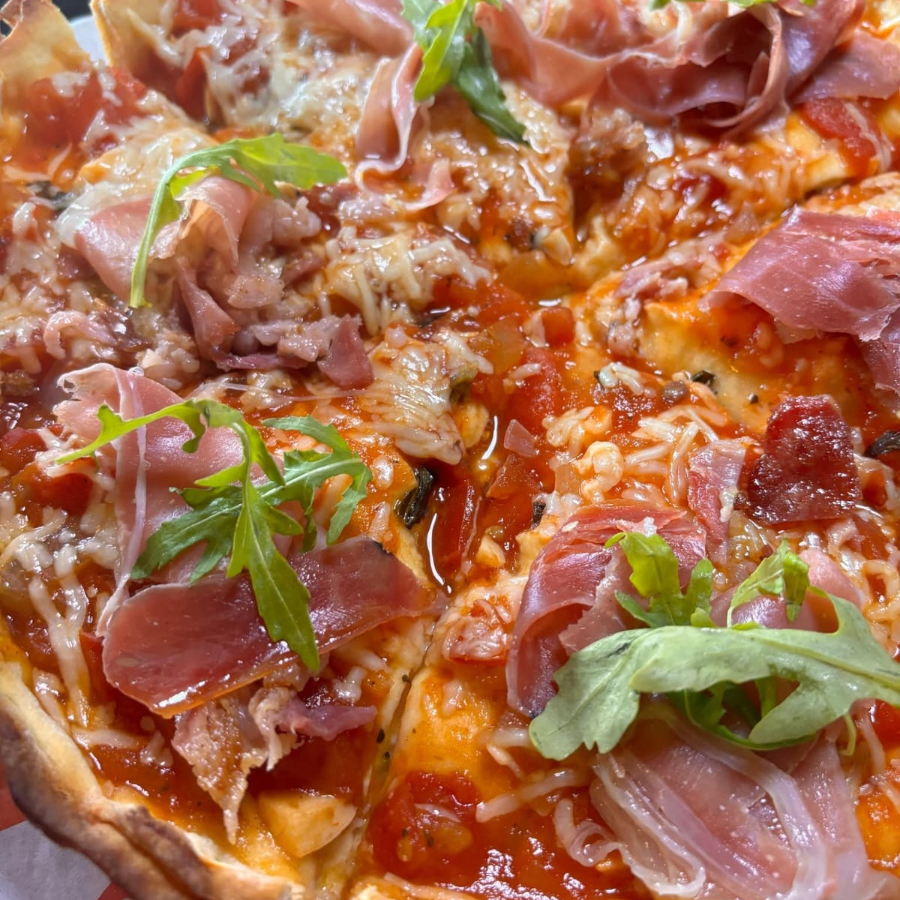 TRADICIONAL PIZZA DE JAMON SERRANO CON ARUGULA SALSA ESPECIAL DE LA CASA, 500 GRS DE MIX DE QUESOS UN VERDAERO DELEITE AL PALADAR