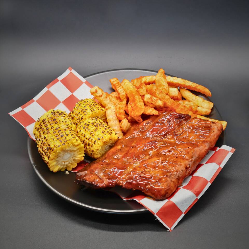 COSTILLAS EN SALSA BBQ, PAPAS FRANCESAS ,1 ELOTE EN RODAJAS.