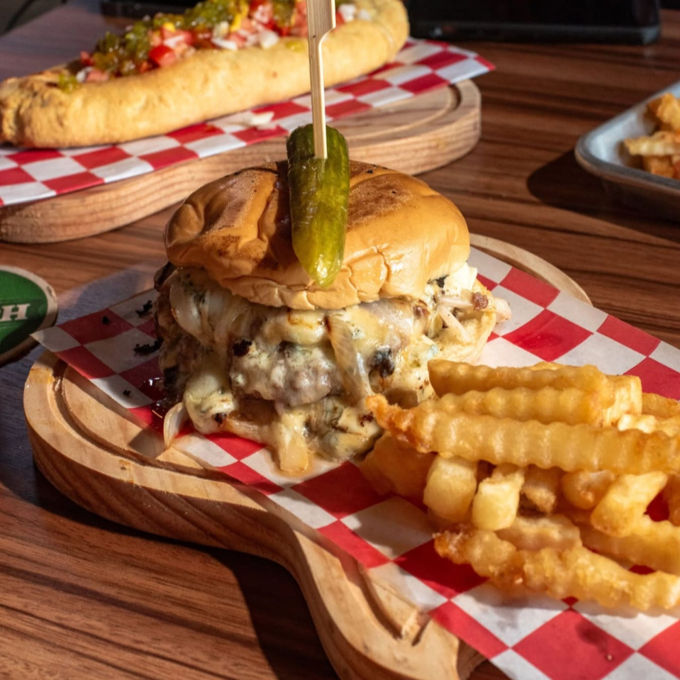 DOBLE CARNE ANGUS DE 120 GRS CADA UNA, QUESO 120 GRS, DOBLE TOCINO 100GRS, CEBOLLA CARAMELIZADA CON MANTEQUILLA Y MIX DE PAPRIKA ACOMPAÑADA DE 150 GRS DE PAPAS A LA FRANCESA CON MIX DE PAPRIKA.