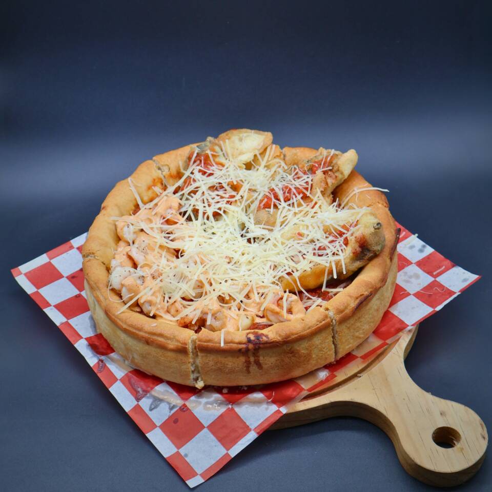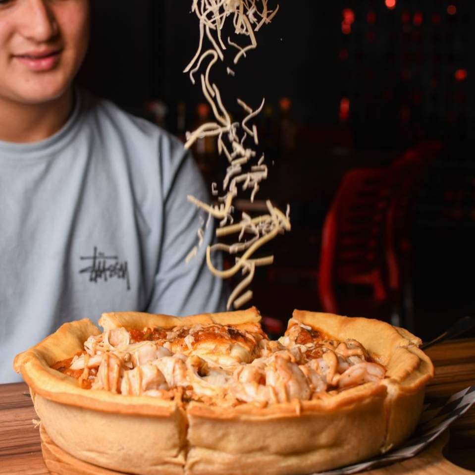 CAMARONES ROCA SAZONADOS Y BAÑADOS CON SALSA SPICY, CON NUESTRA SALSA ESPECIAL DE TOMATES, 500 GRS. DE MIX DE QUESOS. LA MAS QUESOSA Y RECOMENDACION ESPECIAL DEL CHEF