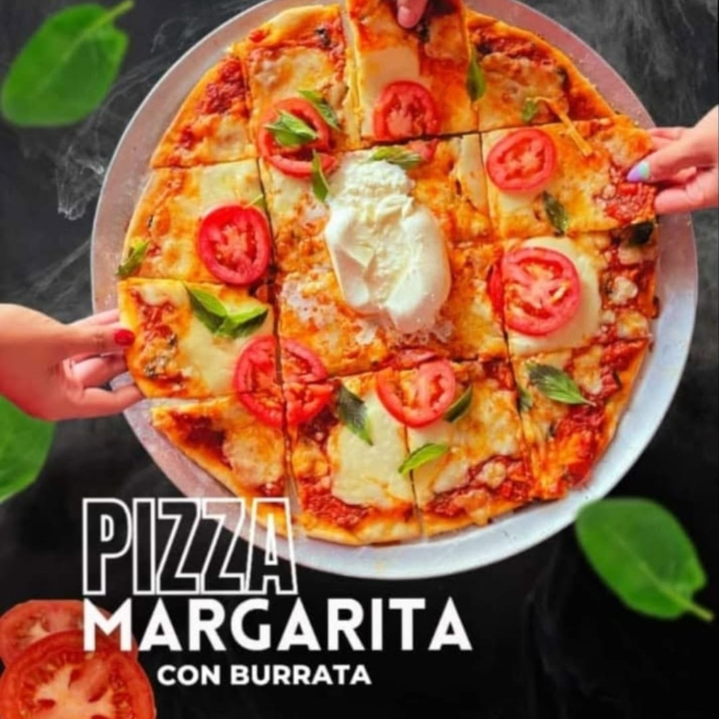 MOZARELLA FRESCO, RODAJAS DE FRESCO TOMATE, HOJAS DE ALBAHACA Y BURRATA CON NUESTRA SALSA ESPECIAL DE TOMATES, 500 GRS. DE MIX DE QUESOS. NO TE PUEDES PERDER ESTA PIZZA CON BURRATA =)