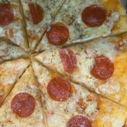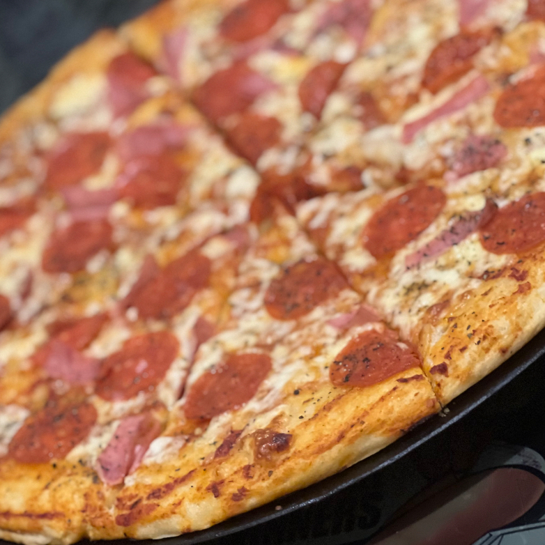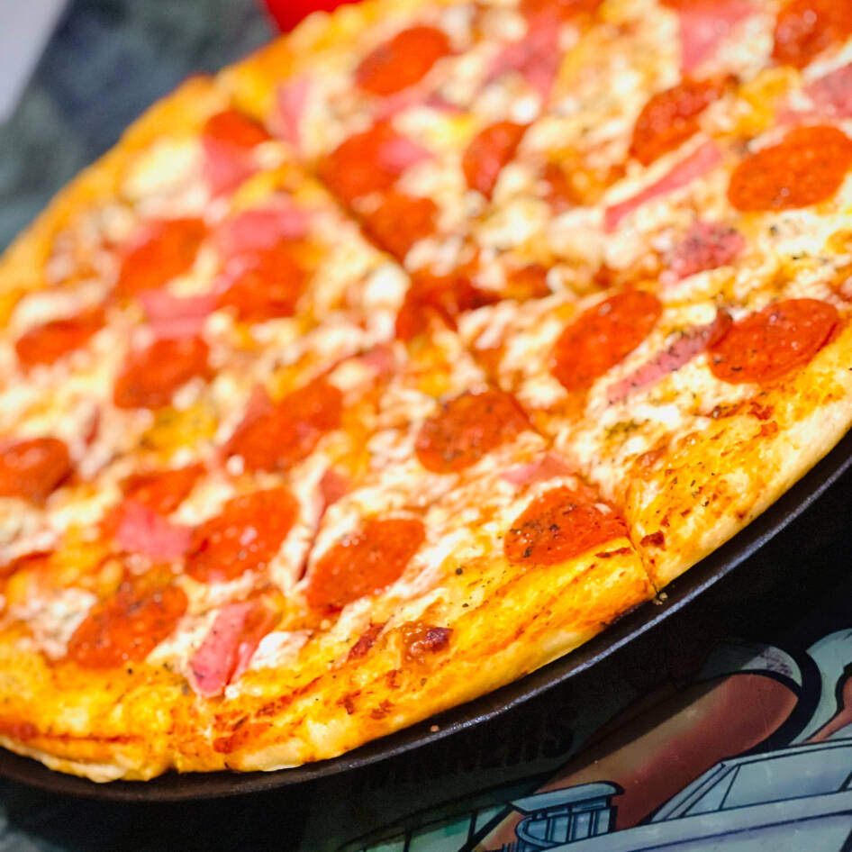 Pizza familiar de pepperoni con base crujiente tres quesos derretidos
