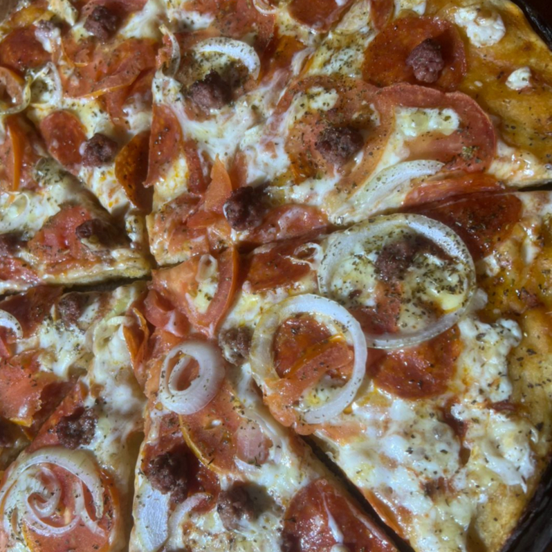 Pizza preparada de manera casera con ingredientes frescos de buena calidad q,ueso derretido sobre una base crujiente, pepperoni, cebolla, tomate y pequeñas bolitas de carne de res sazonadas
