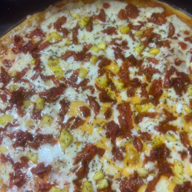 Pizza familiar hawuaiana con base crujiente y tres quesos derretidos