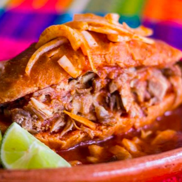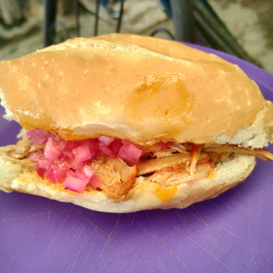 pan de bolillo o media barra lleva carne y cebolla curtida y caldo de la cochinita y su salsa habanera.