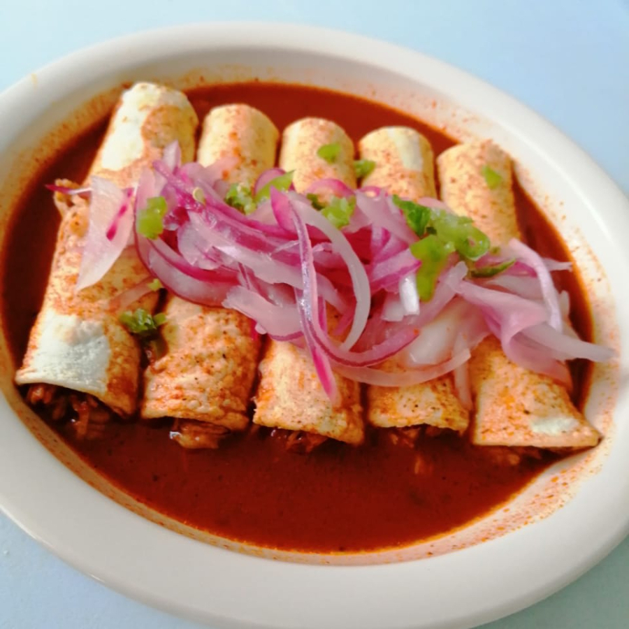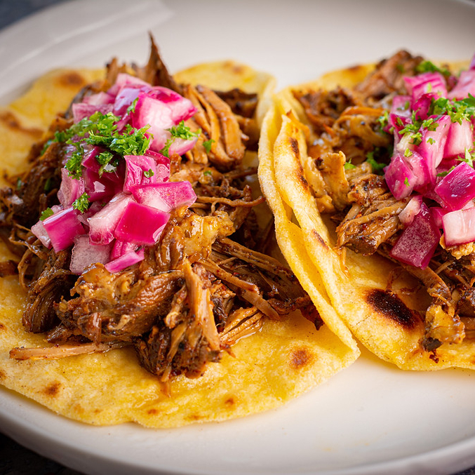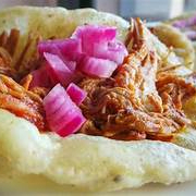 maza de maiz lleva carne de puerco y cebolla curtida y su salsa habanera.