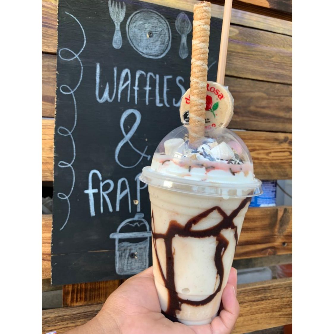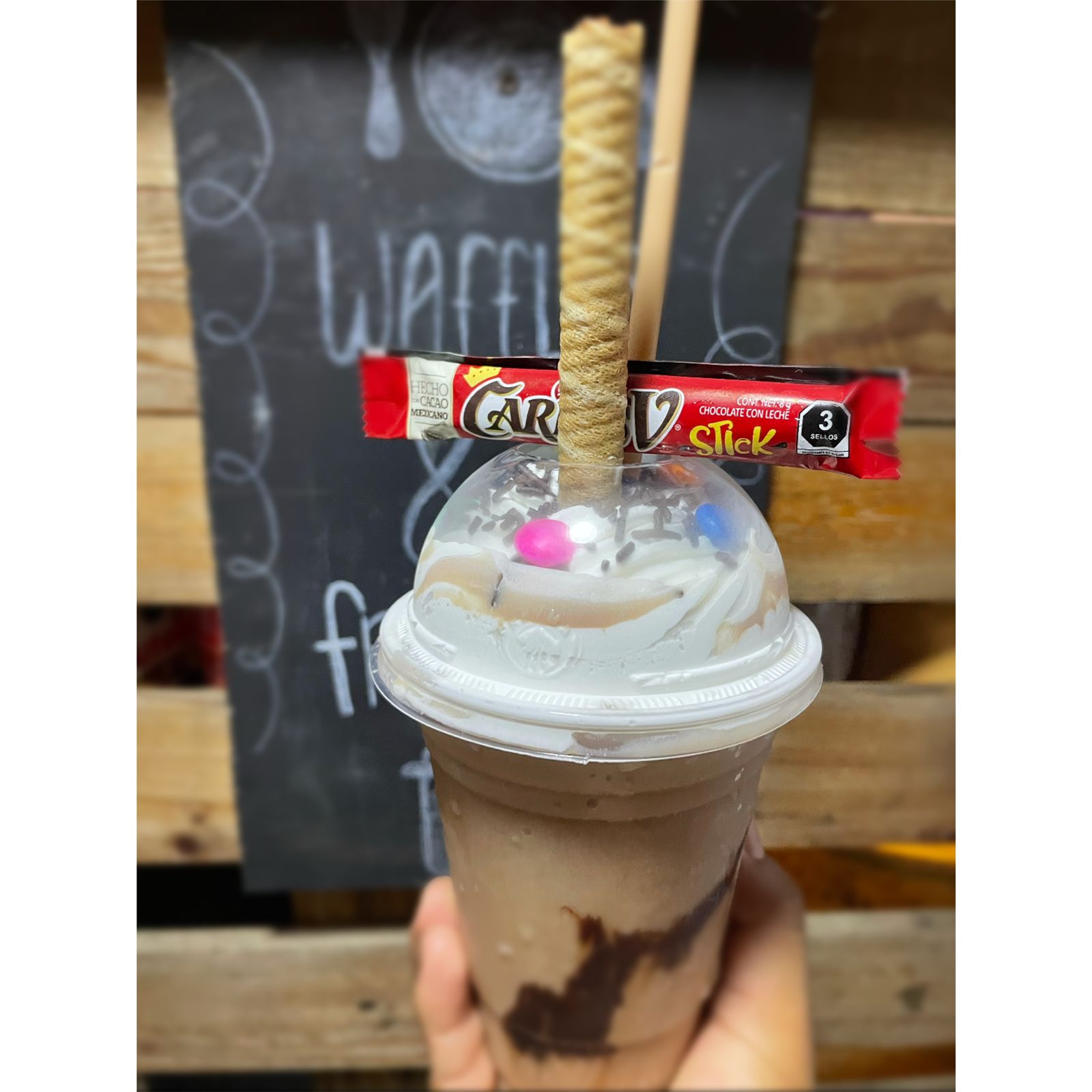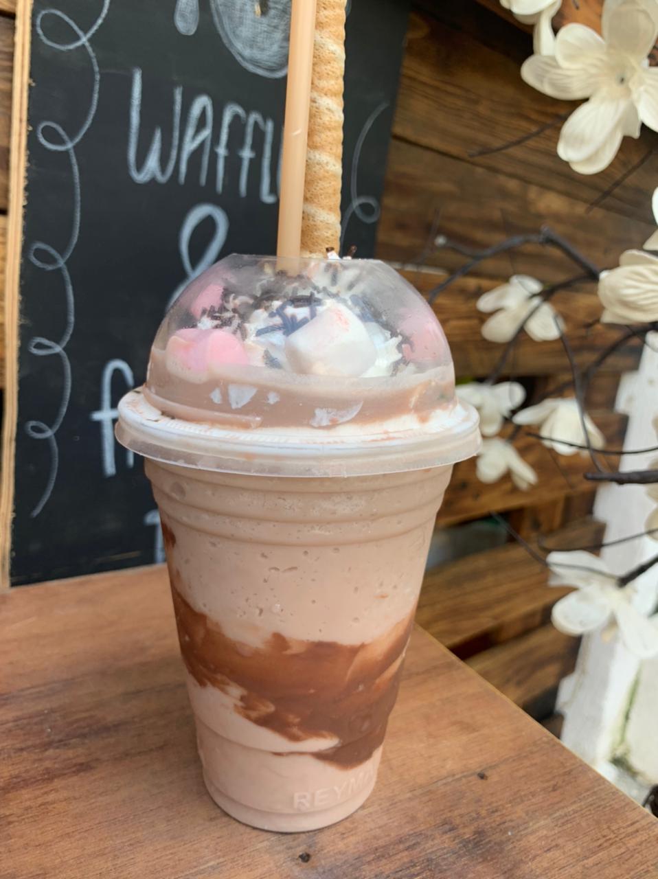 Hecho con Café, sustituto de crema. Decorado con chantilly, lunetas, chispas de chocolate, bombones. Incluye: barquilla de chocolate Y 1 popote.