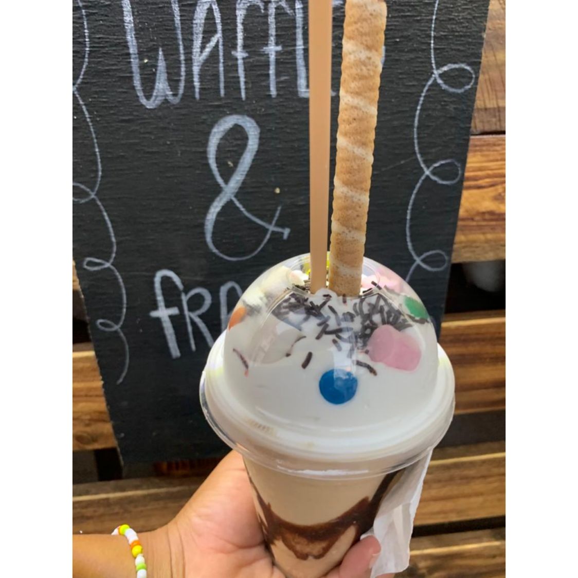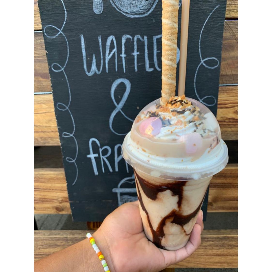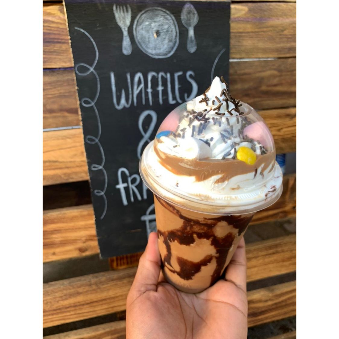 Hecho con Café, sustituto de crema. Decorado con chantilly, lunetas, chispas de chocolate, bombones. Incluye: barquilla de chocolate Y 1 popote.