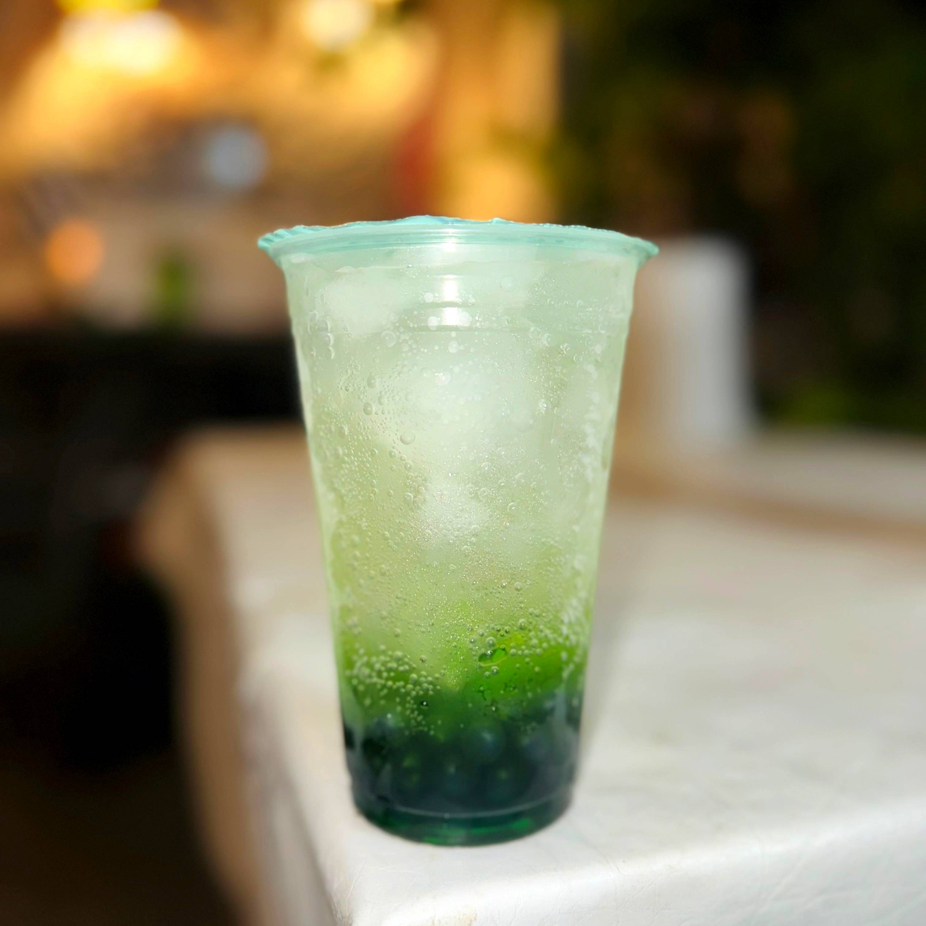 Vaso 16oz, Soda, hielo, sirup manzana verde y balas explosivas.