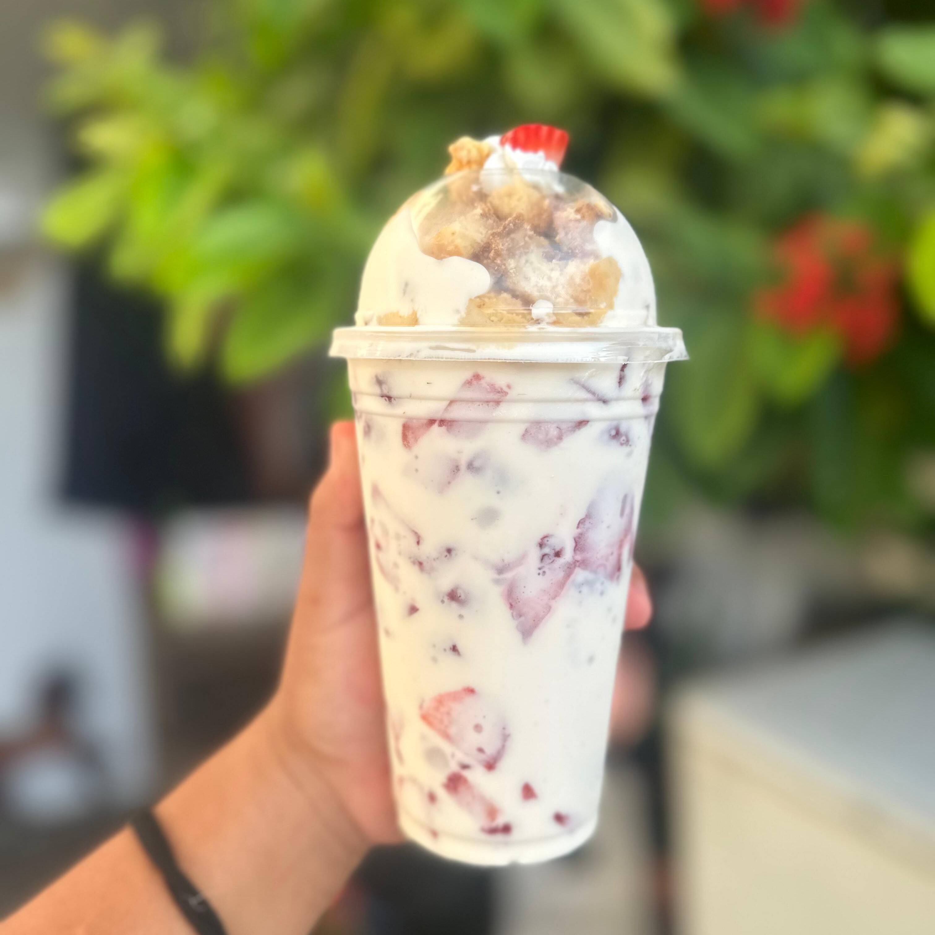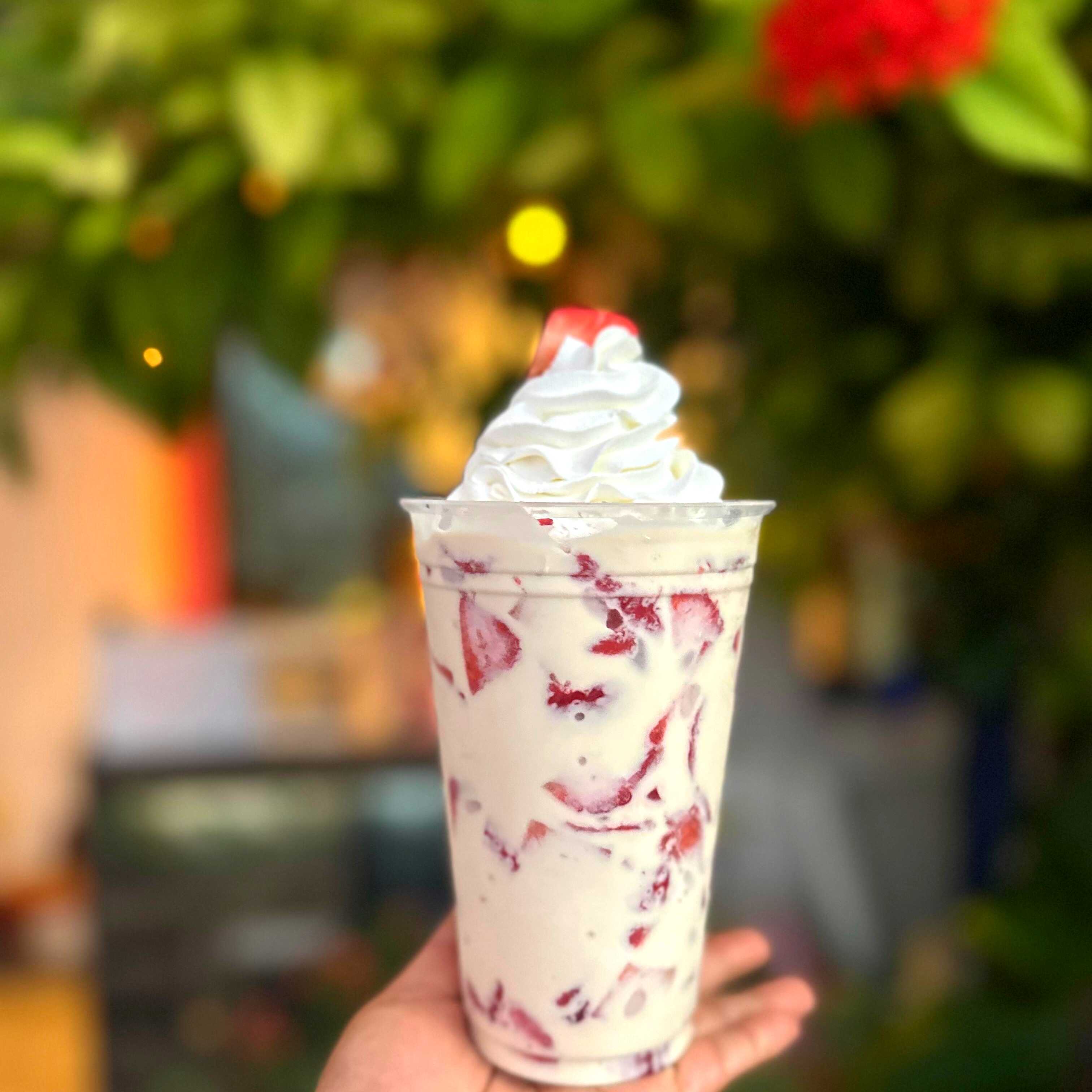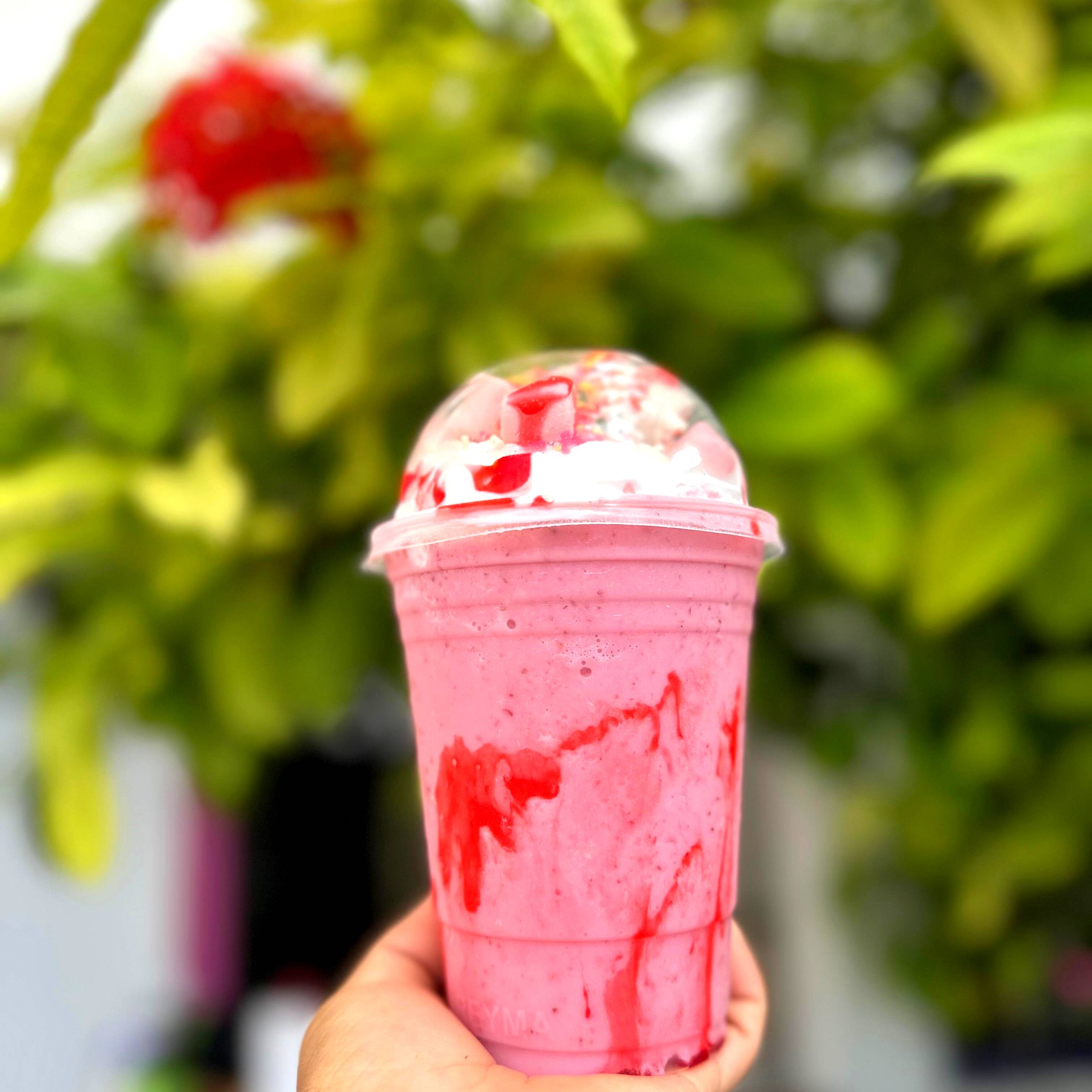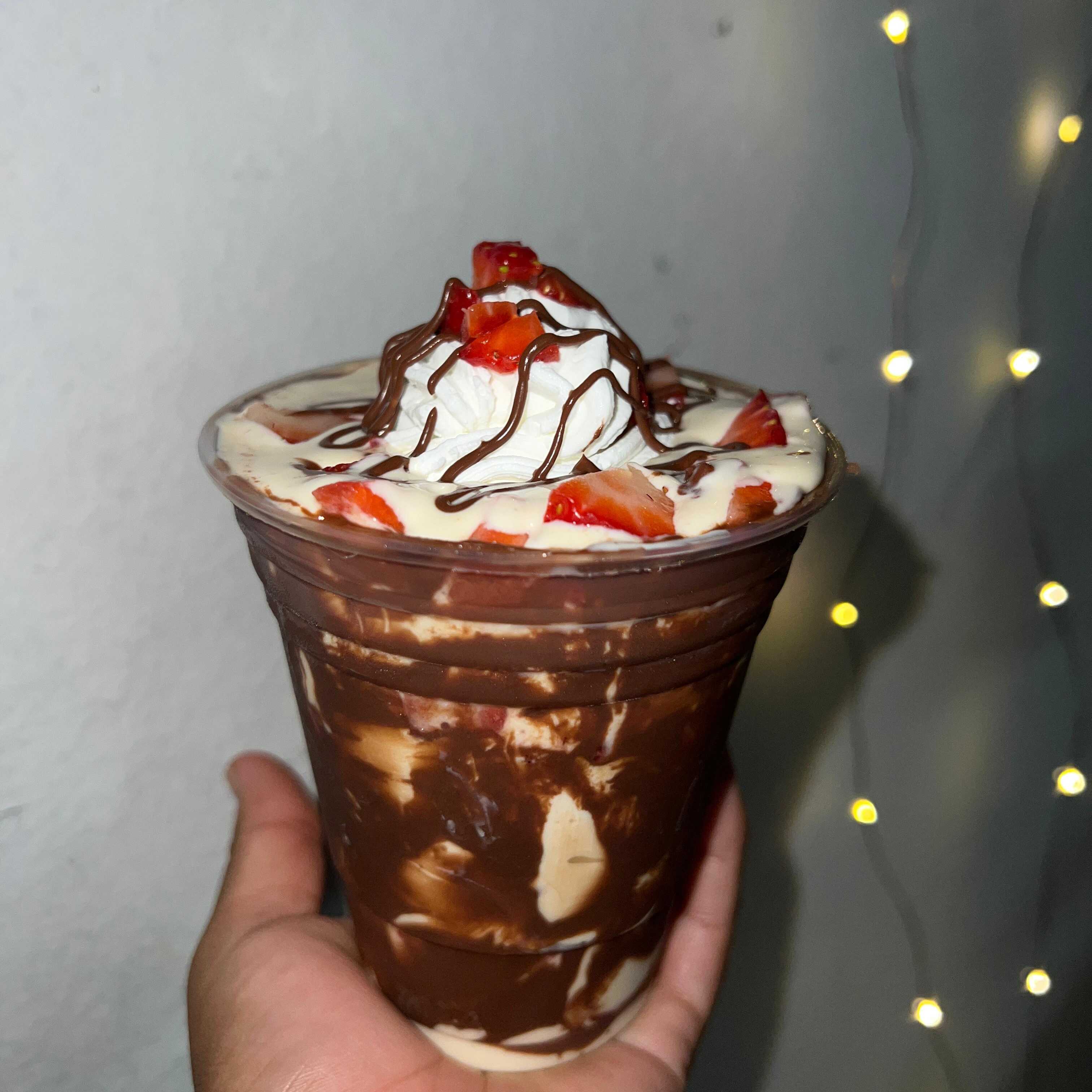 Hecho con Fresa natural. Decorado con chantilly, bombones, chispas de colores, hershey's de fresa. Incluye: barquilla de chocolate y 1 popote.