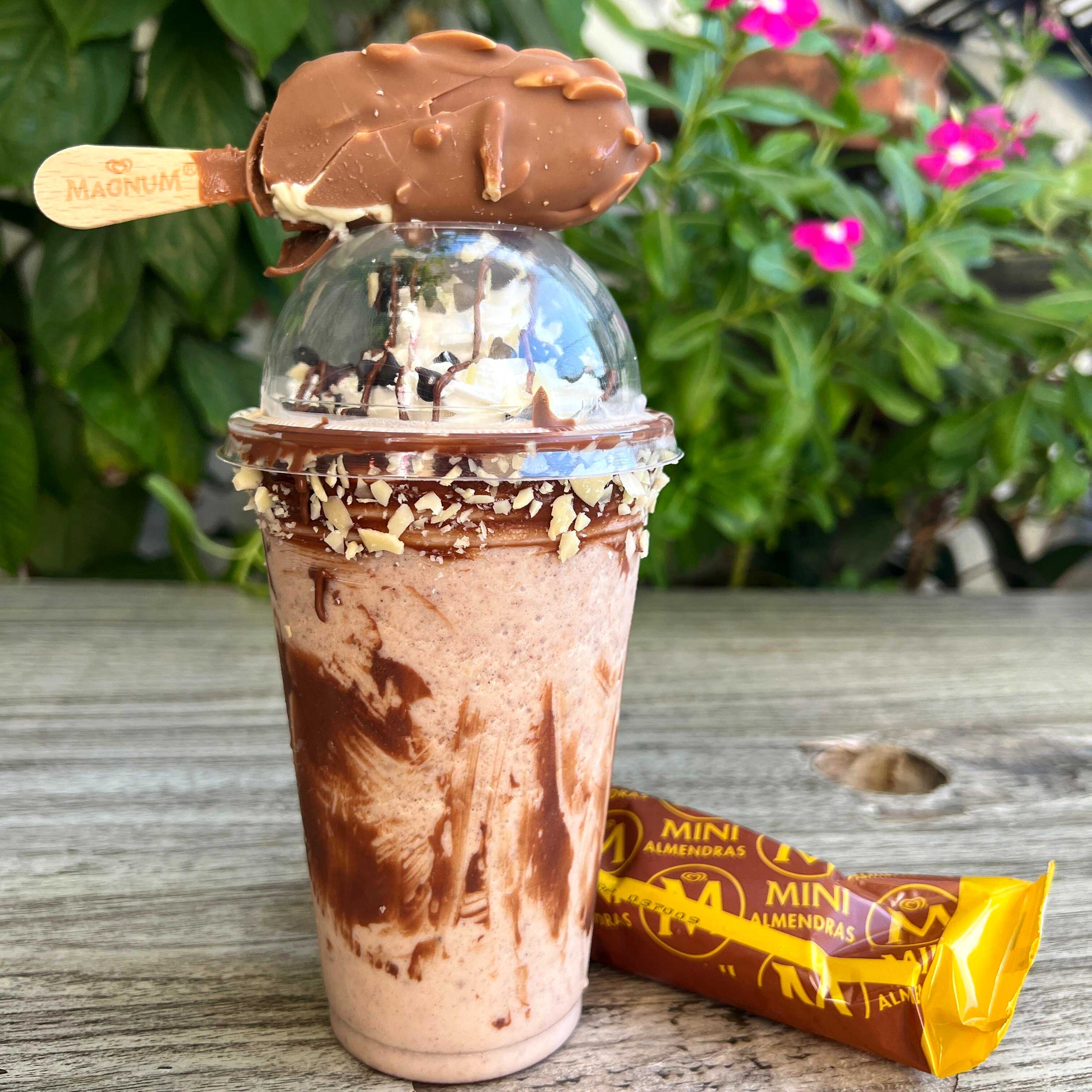 Frappe de magnum almendras. Hecho con la paleta magum y almendras. escarchado con nutella y almendras, chispas de chocolate. INCLUYE 1 mini paleta MAGNUM, barquilla de chocolate y 1 popote.