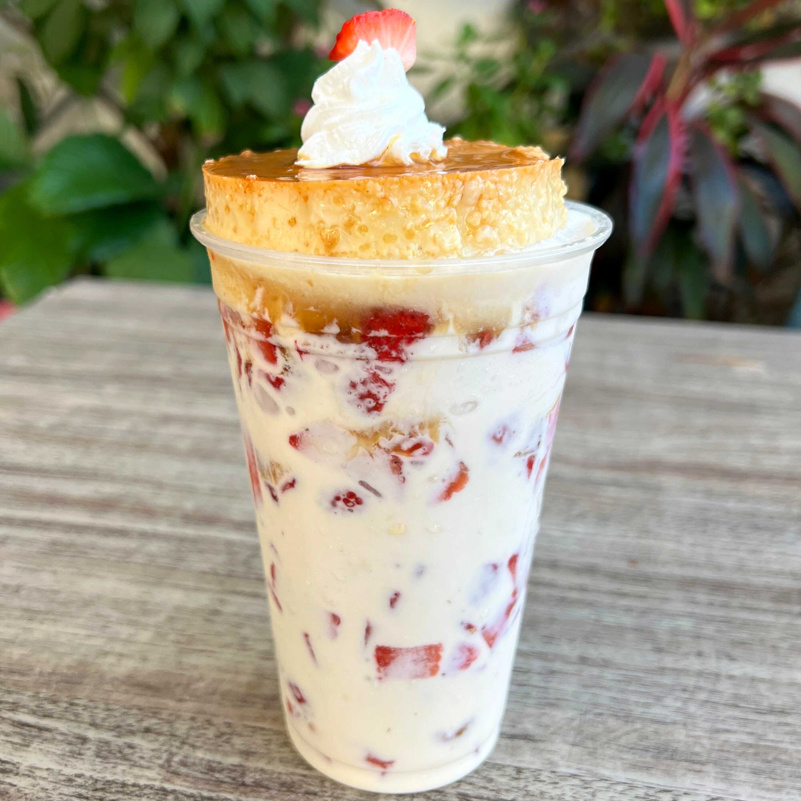 Hecho con base polvo sabor flan napolitano. Decorado con chantilly, jarabe de caramelo y mini flan casero. Incluye: barquilla de chocolate y 1 popote.