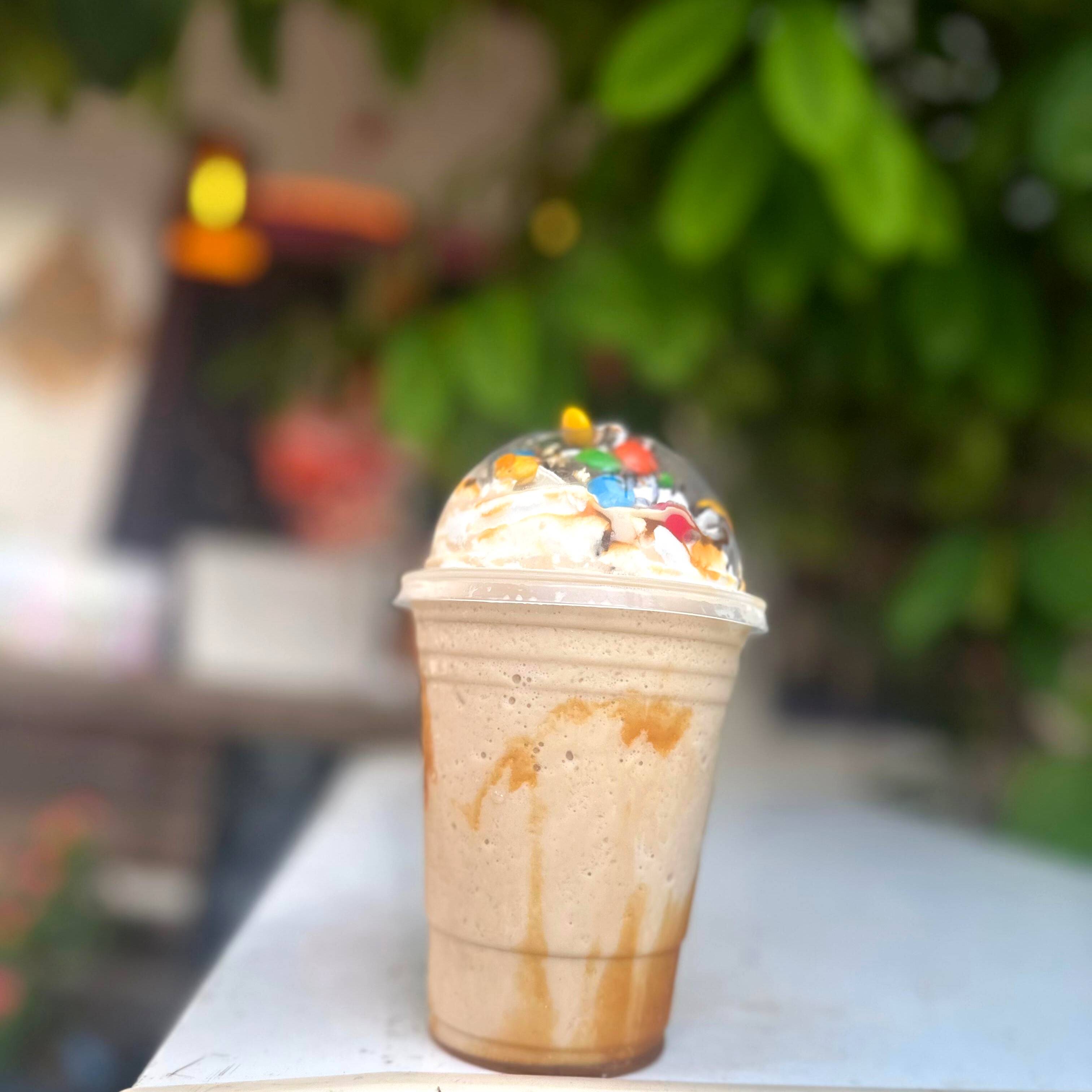 Hecho con jarabe de caramelo. Decorado con chantilly, chispas de colores, lunetas. Incluye: barquilla de chocolate y 1 popote.