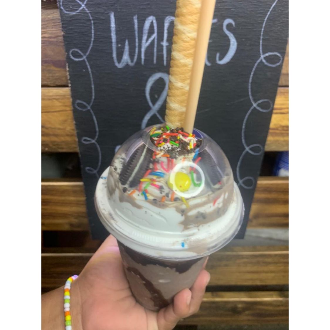 Hecho de galleta oreo, Decorado con chantilly, oreo espolvoreado, lunetas, chispas de colores, 1 galleta oreo. Incluye: barquilla de chocolate y 1 popote.