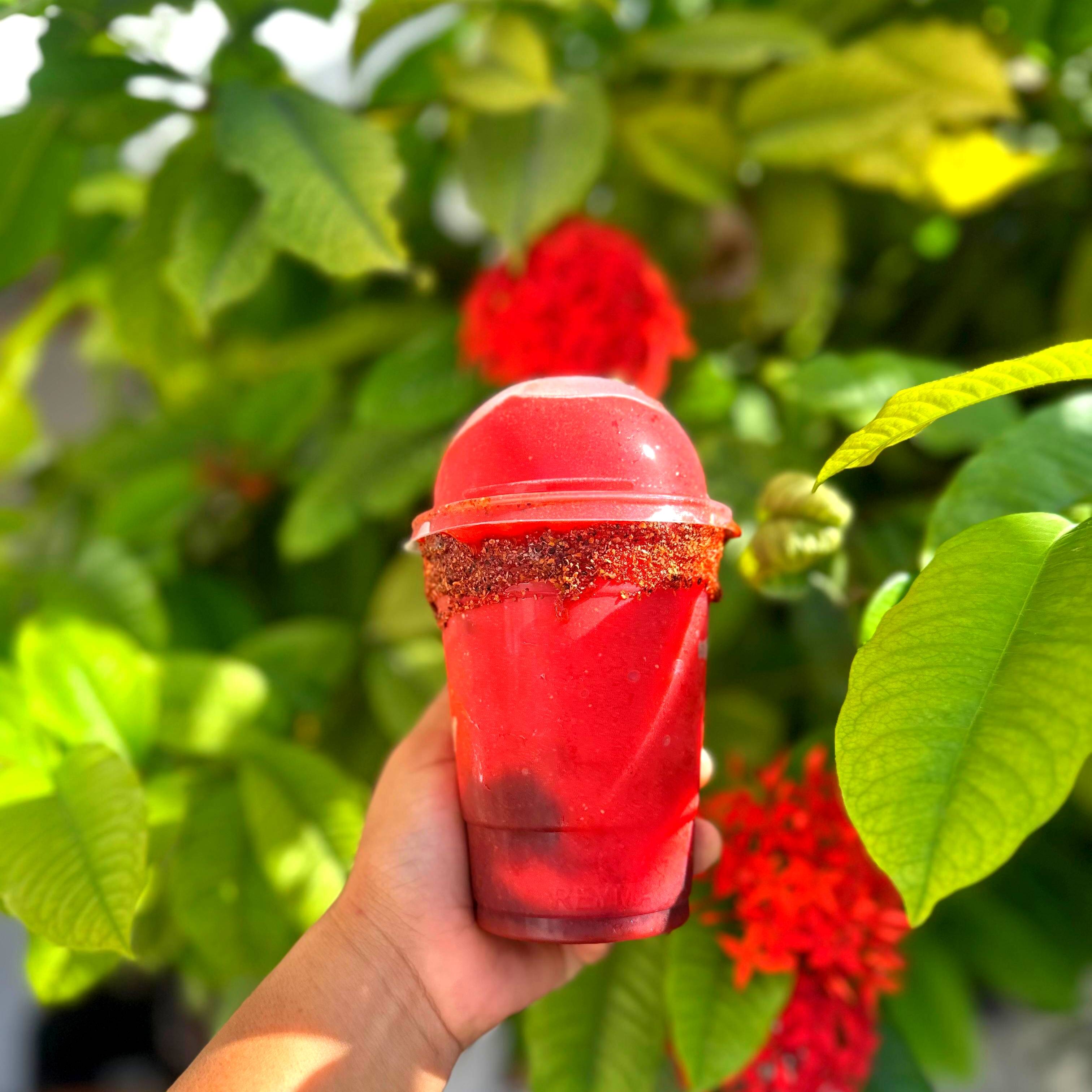 Eleborado con pulpa 100% natural de fresa contiene chamoy y miguelito, escarchado de pulpa de chamoy. Incluye 1 barquilla de chile y 1 popote.