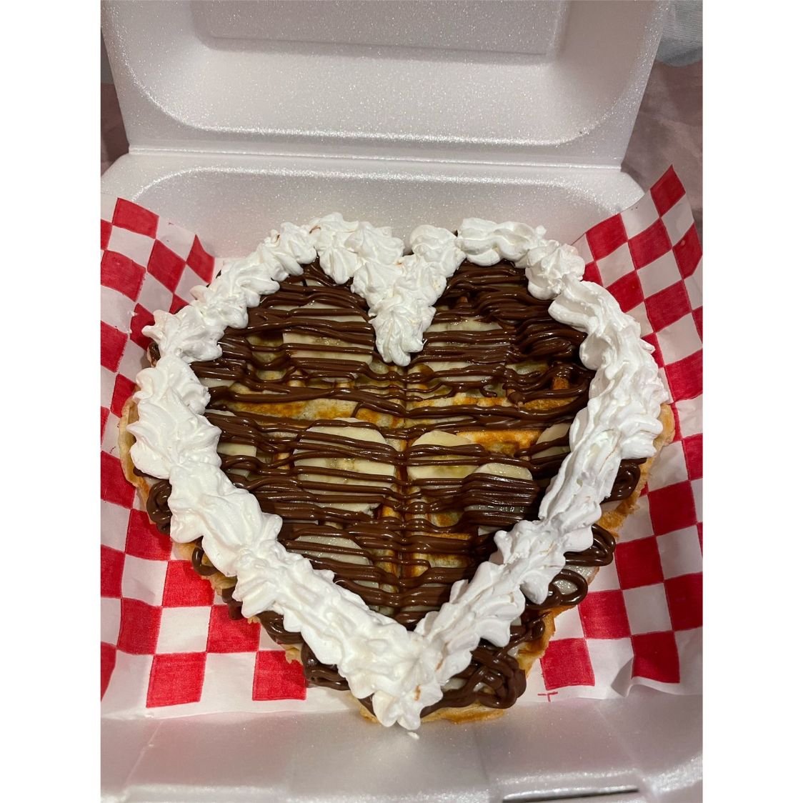 Waffle en forma de corazón. Acompañado con chantilly, 1 topping y 1 fruta. Con dedicatoria en "comentarios".