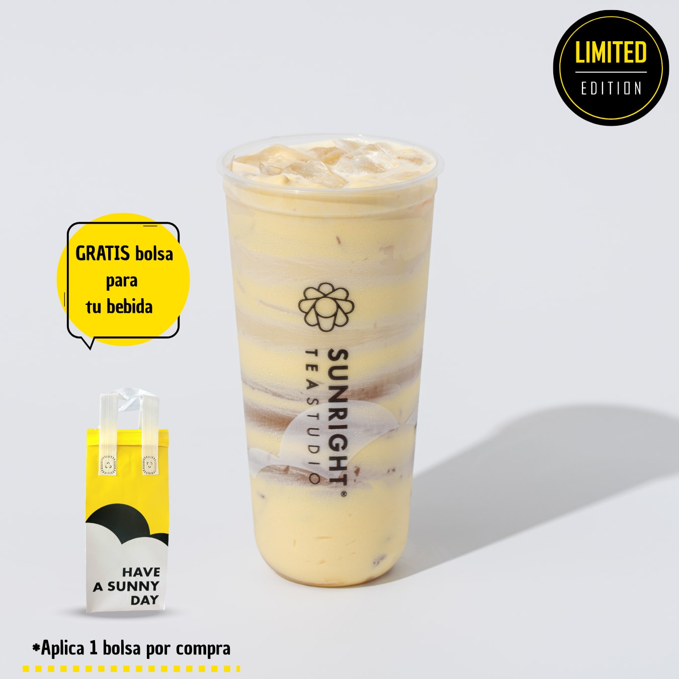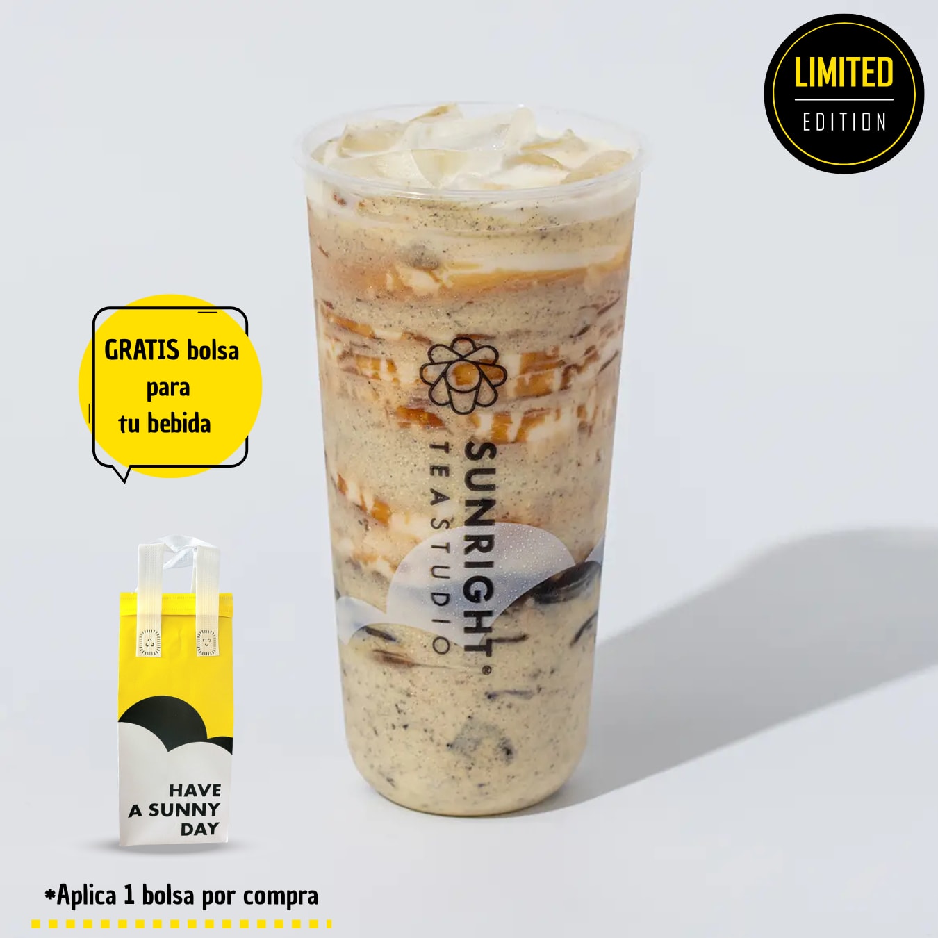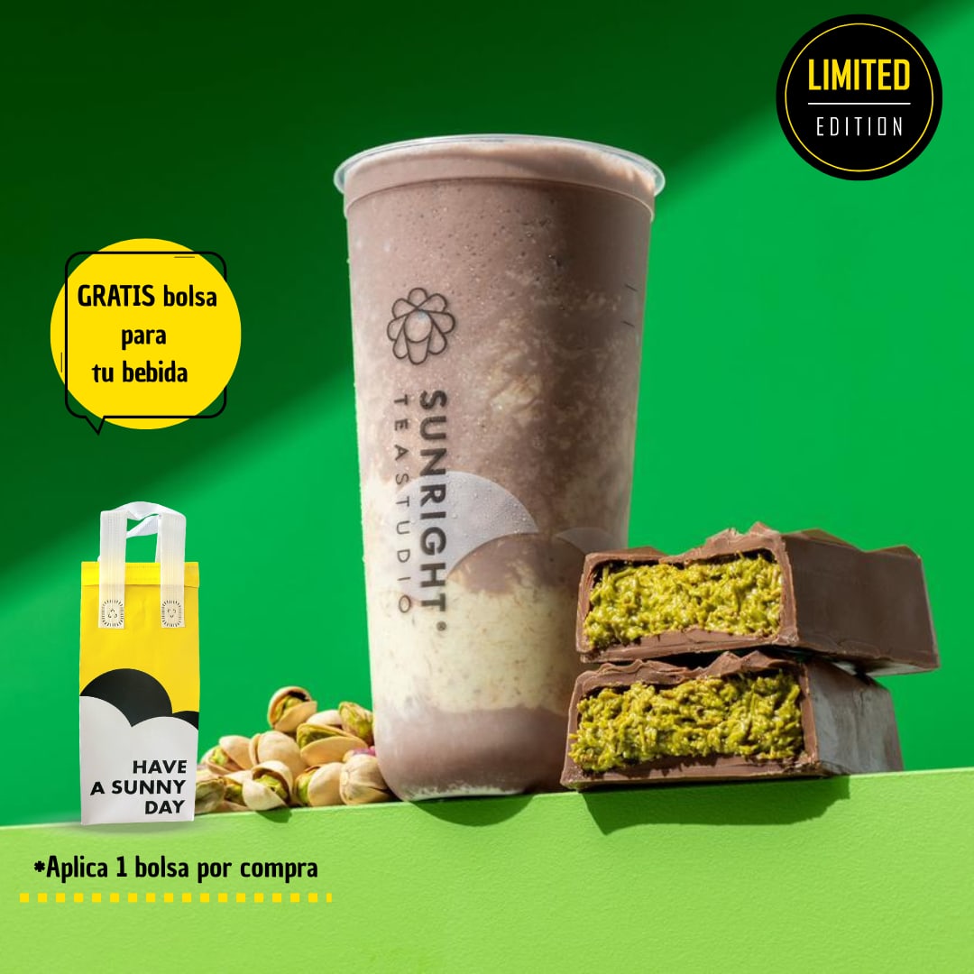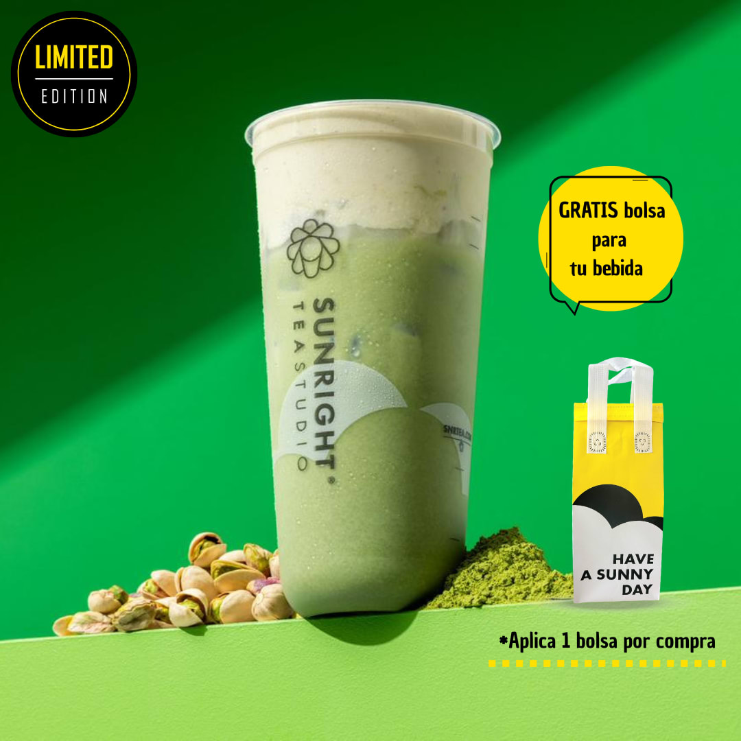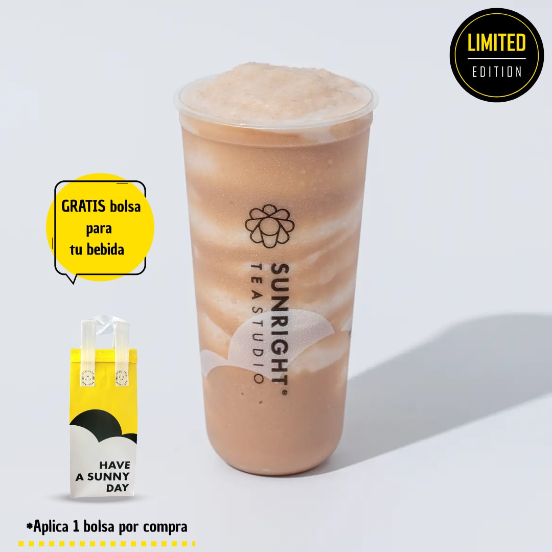 Combinación de Matcha con té de cuatro estaciones preparado con leche de avena y Crema Brulée sabor a caramelo.