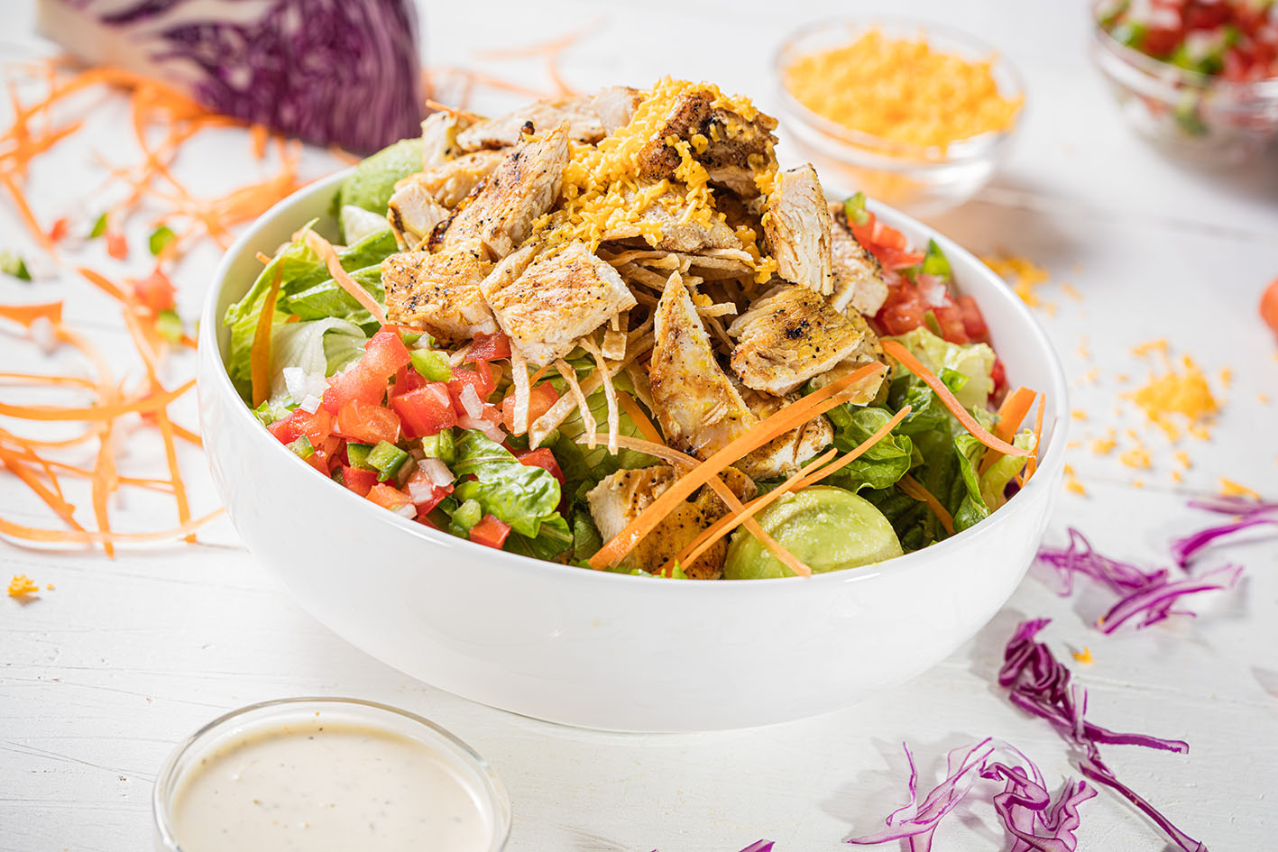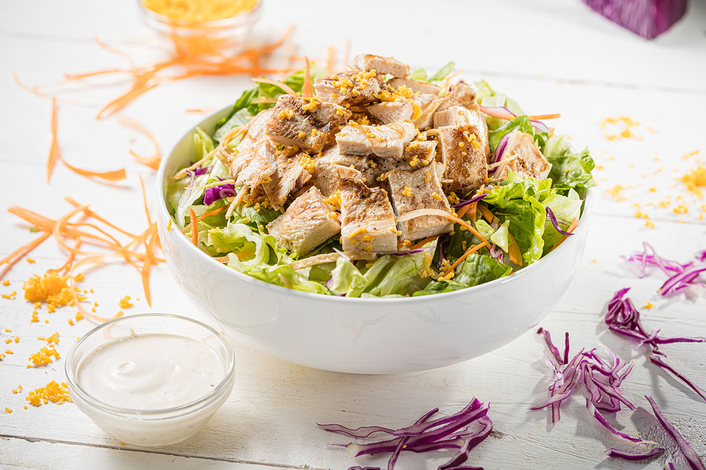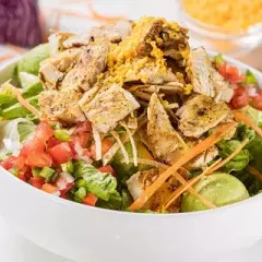 Pollo, lechuga mixta, zanahoria, col morada, frituras, queso cheddar y aderezo Ranch.