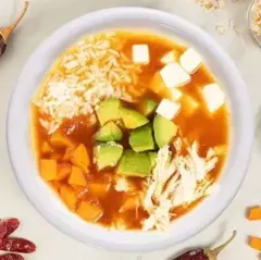 Consomé de pollo con mezcla de chiles secos y tomate con arroz, queso panela, aguacate, zanahoria ypechuga de pollo desmenuzada