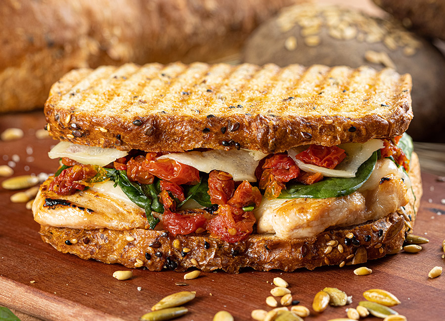 Sandwich en pan multigrano, pollo al grill, queso provolone, tomate deshidratado, espinaca baby, albahaca, mantequilla ghee con ajo y romero
