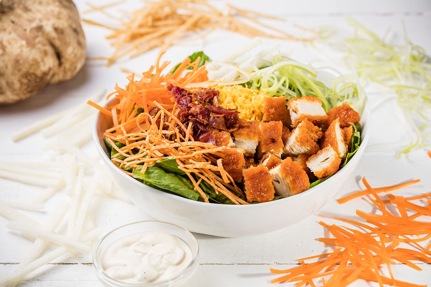 Pechuga empanizada, salsa buffalo, lechuga, jicama, apio, zanahoria rallada, queso cheddar, bacon bits, frituras y aderezo a tu elección