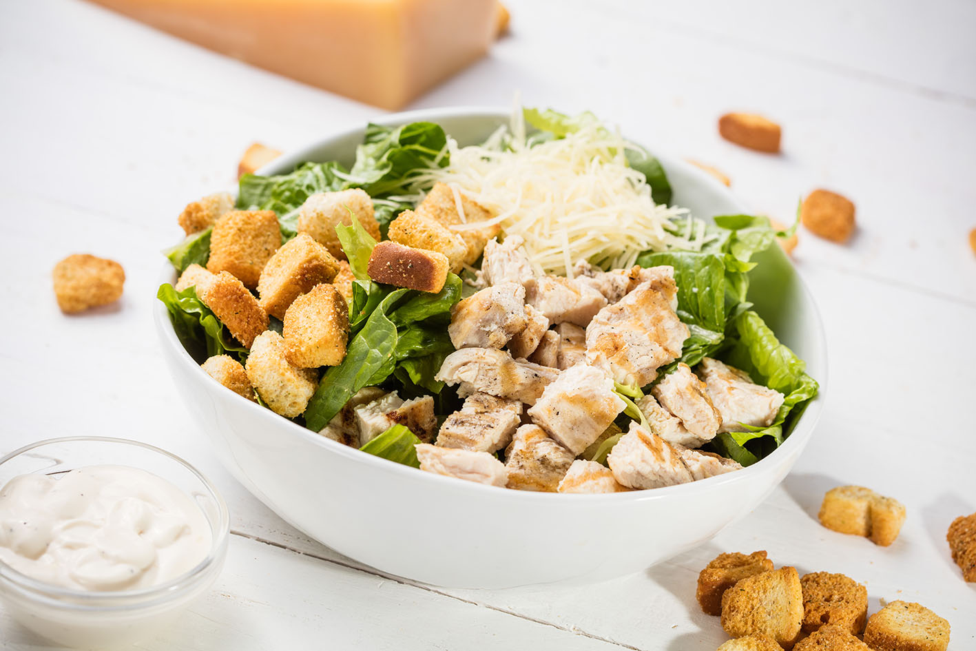 Pollo, lechuga orejona, croutones, queso parmesano y aderezo César