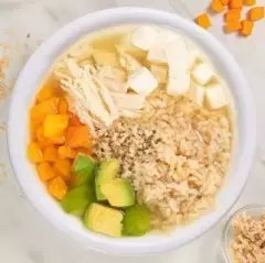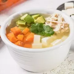 Consomé de pollo con brown rice y quinoa, queso panela, aguacate, zanahoria, pechuga de pollo desmenuzada y chipotle