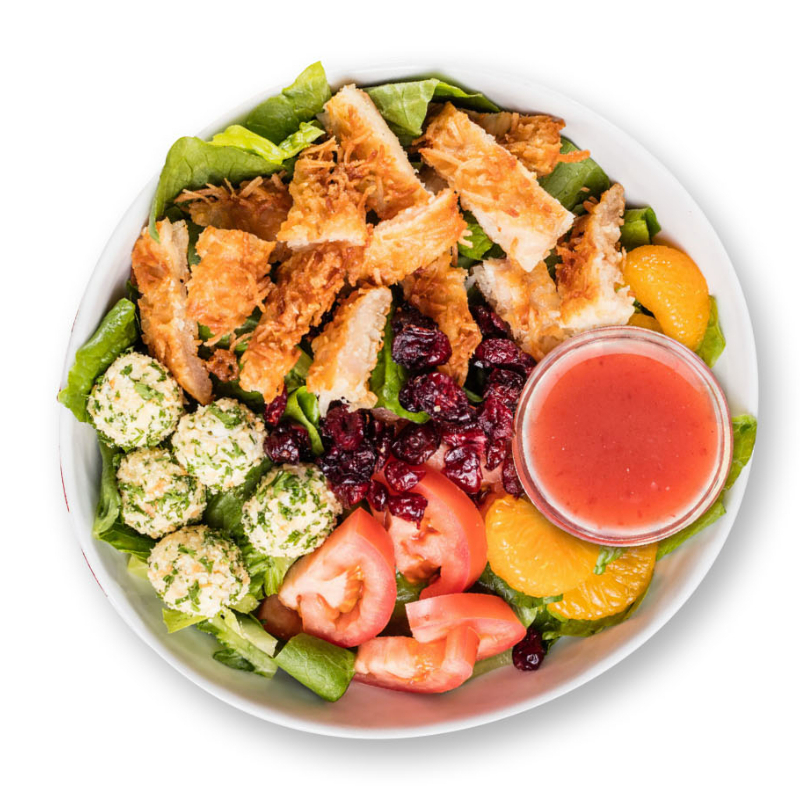 Pollo al coco, lechuga, mandarina, arándanos, tomate, bolitas de queso con perejil y cacahuate tostado, con aderezo Raspberry