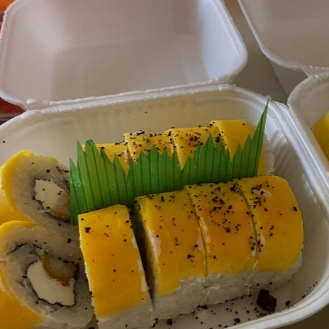 ROLLO FRUTAL DE MANGO POR DENTRO LLEVA CAMARÓN EMPANIZADO, PEPINO Y AGUACATE