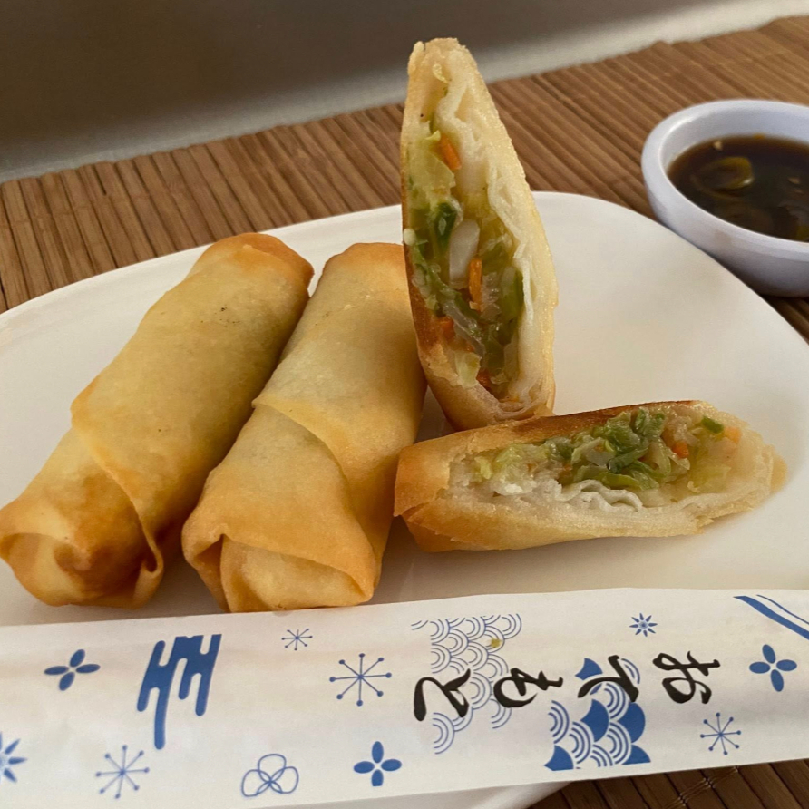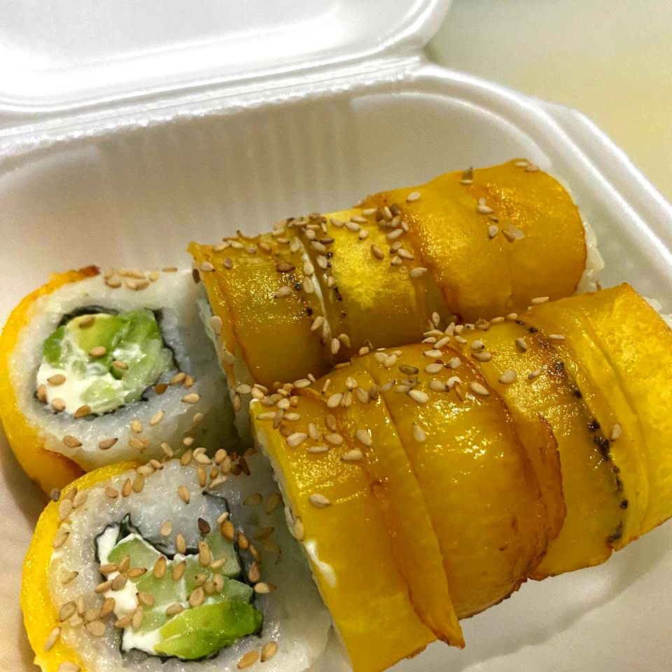 ROLLO DE PLATANO FRITO POR FUERA Y POR DENTRO LLEVA QUESO CREMA, PEPINO Y AGUACATE CON UN TOQUE DE AJONJOLI