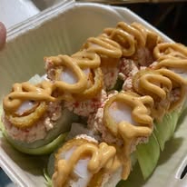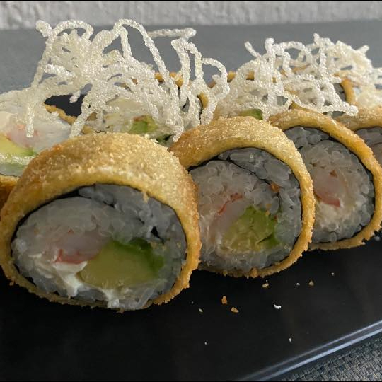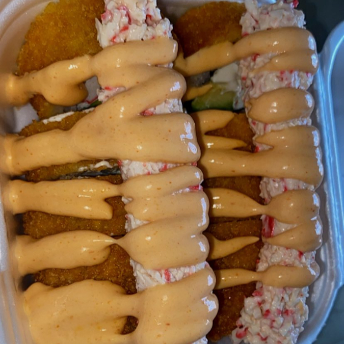 ROLLO EMPANIZADO DE 10 PIEZAS, POR DENTRO LLEVA SURIMI, AGUACATE Y QUESO CREMA. POR FUERA ES EMPANIZADO CON TAMPICO Y CHIPOTLE
