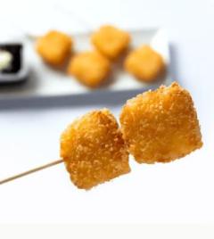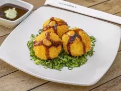 110 gramos. 3 bolas de arroz mezcladas con cebollín, cebolla, queso crema y chiles toreados; empanizadas y bañadas con salsa kushiage y salsa chipotle, sobre una cama de cebollín.