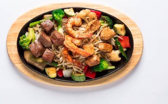 Pollo (40g), filete de res (40g), camarón (3 piezas) y verduras asadas (200g); elaborado a la plancha en nuestra cocina.