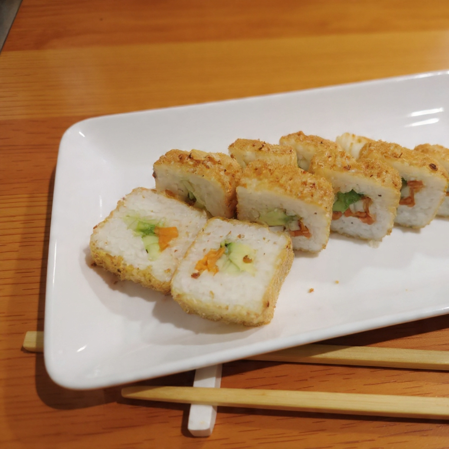 Rollo con alga, pepino, aguacate y zanahoria. Rollo empanizado con topping de Tampico.