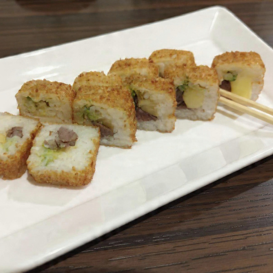 Arrachera, manchego y aguacate. Rollo empanizado.