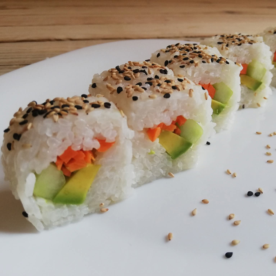 Rollo con alga,pepino, aguacate, y zanahoria. Por fuera ajonjolí.