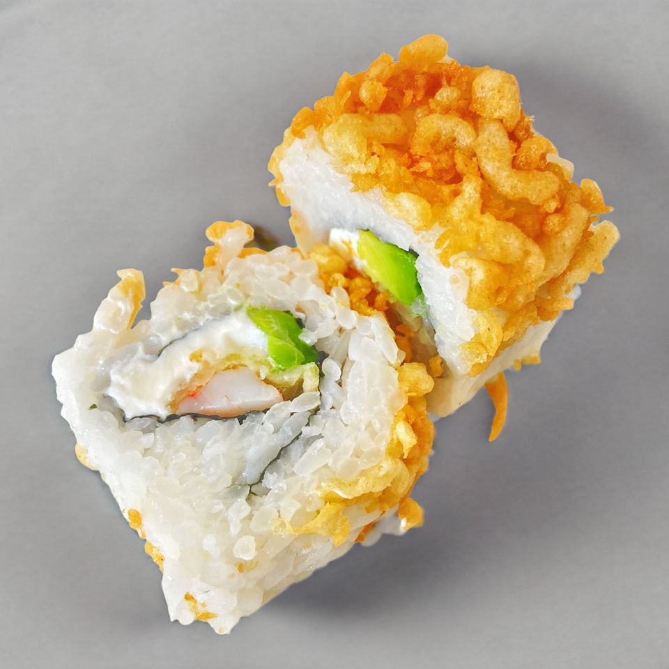 Por dentro camarón capeado y aguacate, por fuera queso crema y topping de tampico.