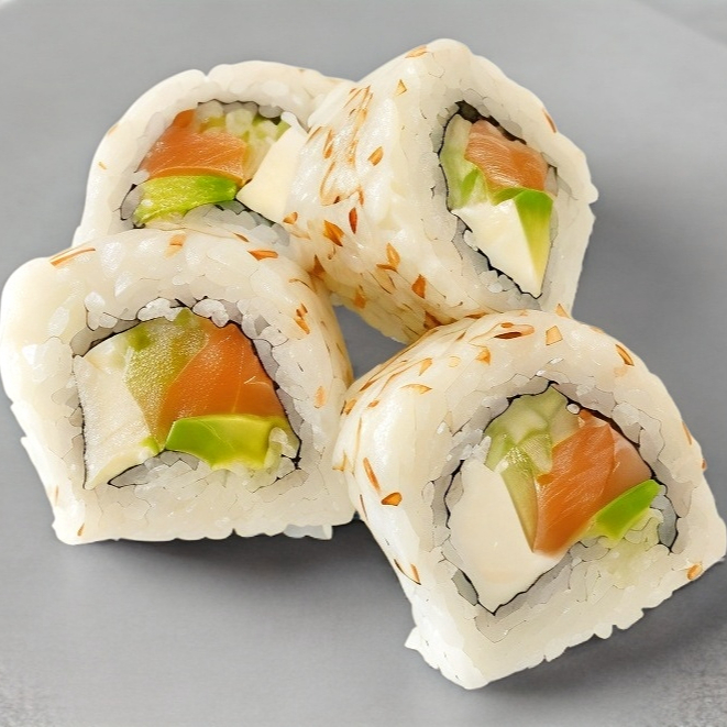 Salmón, mayonesa, masago, rayu, cebollín, aguacate y ajonjolí.