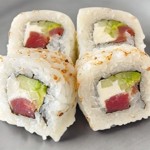 P/D Atún, aguacate, pepino y queso crema P/F Ajonjoli