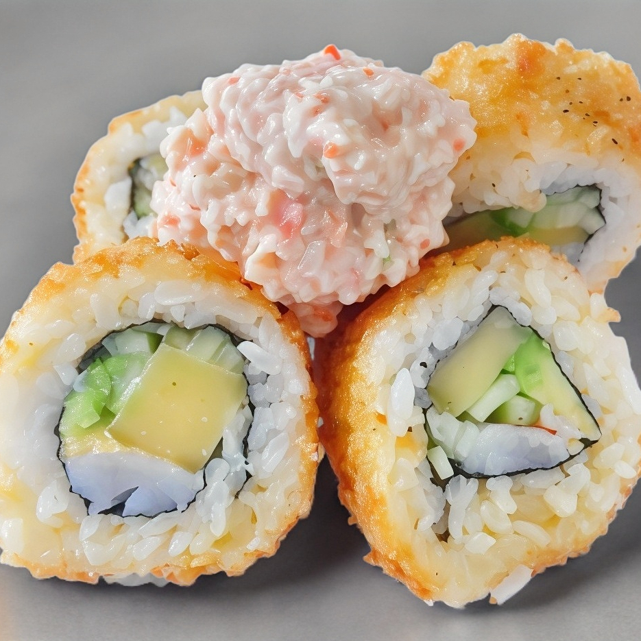 Por dentro aguacate, pepino, zanahoria y Philadelphia, por fuera empanizado y topping de tampico.