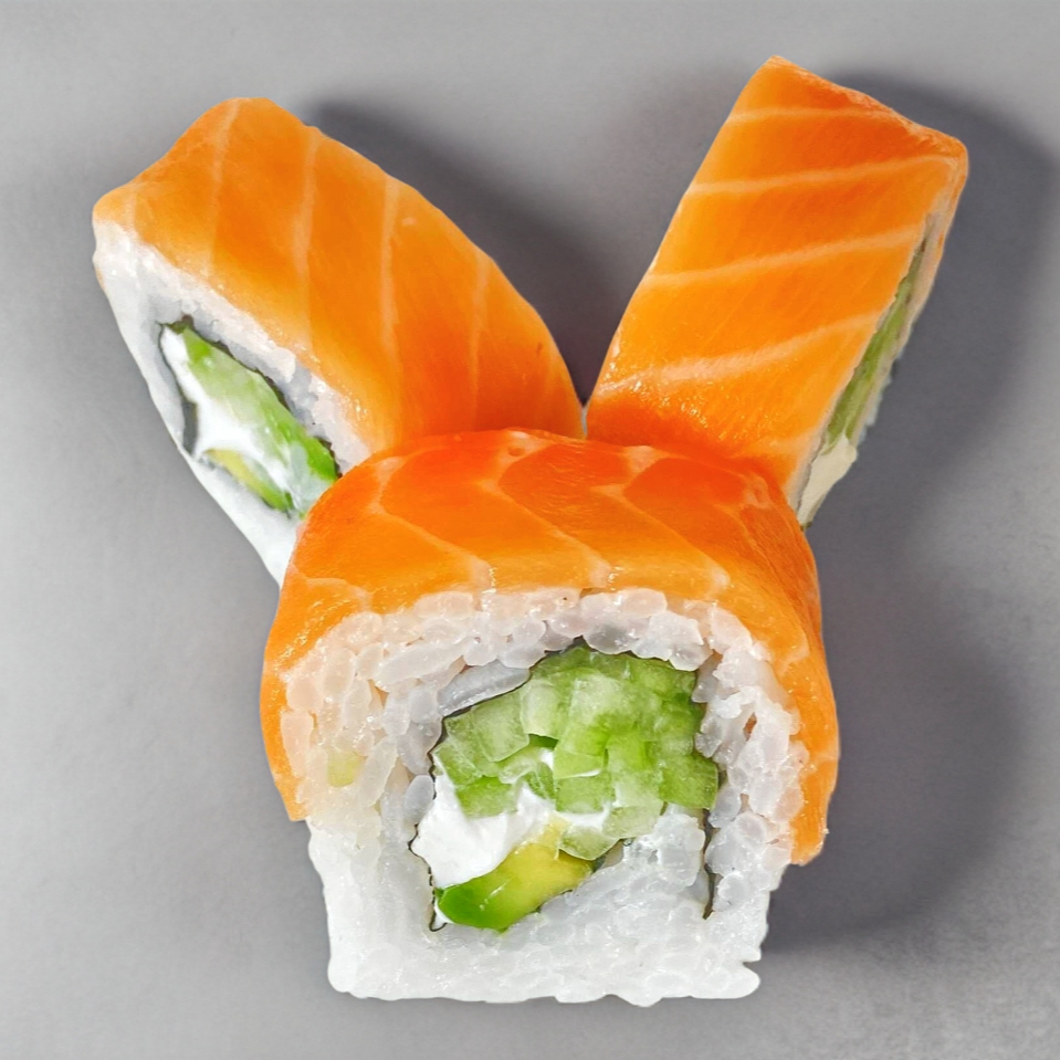 Por dentro queso crema, aguacate y pepino, por fuera salmó.