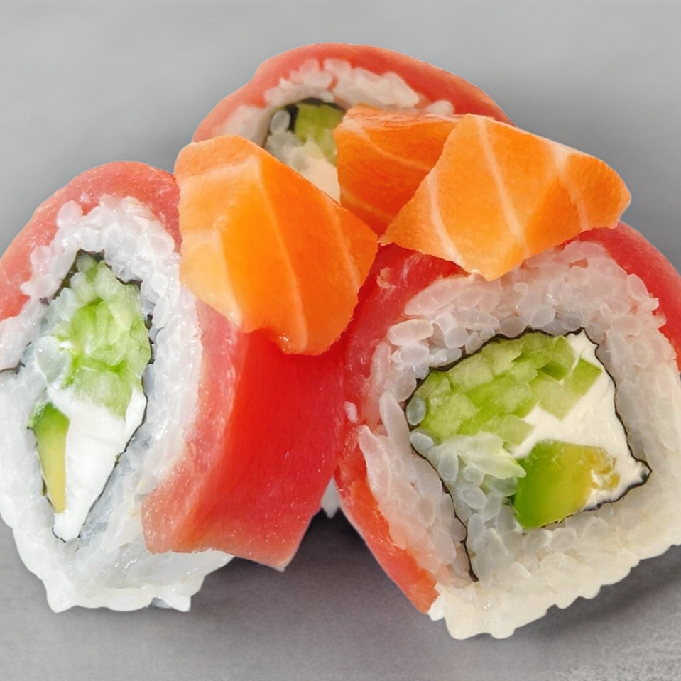 Por dentro pepino, aguacate y queso crema, por fuera, atún y trozos de salmón natural.