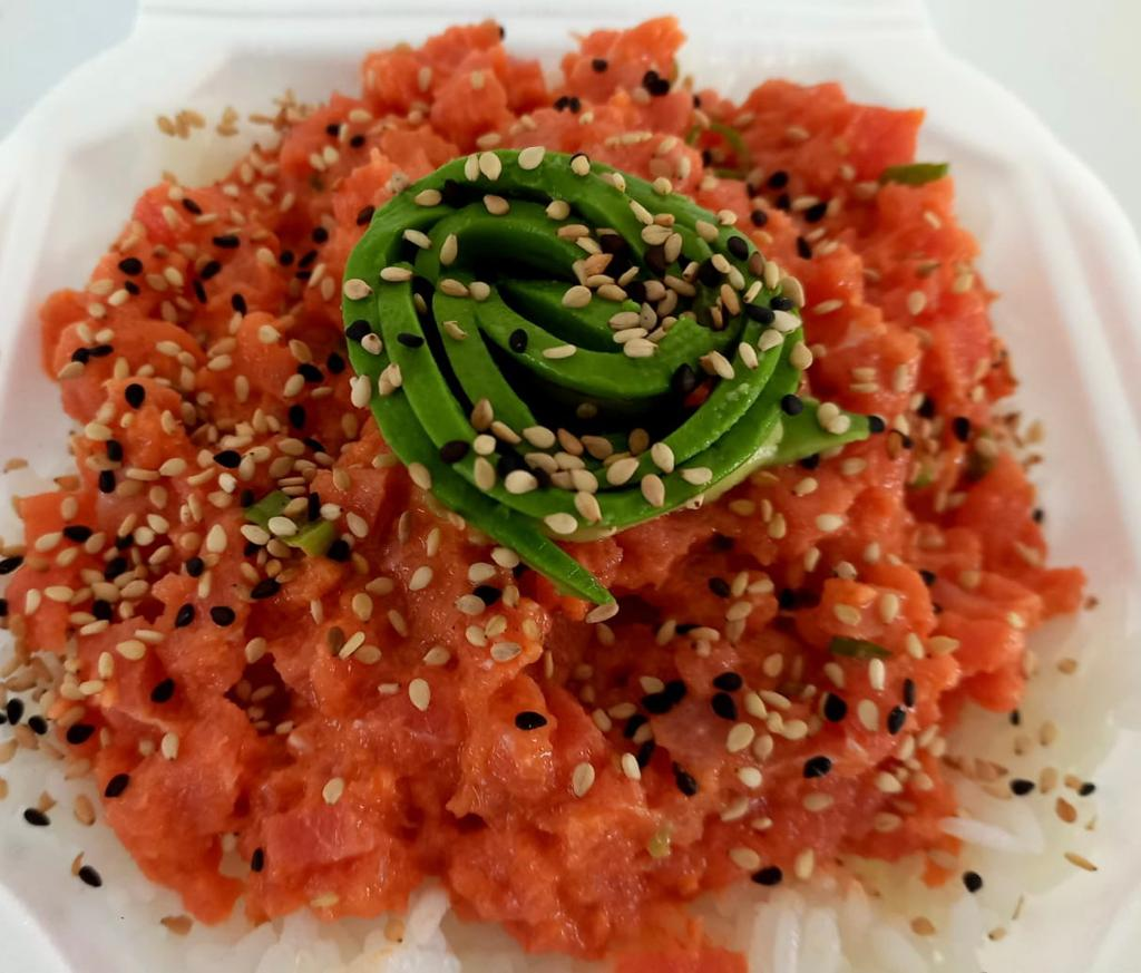 Atún, mayonesa, masago, rayu, cebollín, aguacate y ajonjolí.
