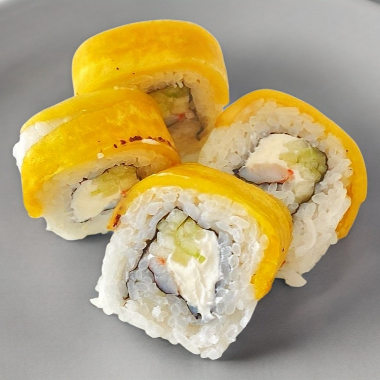 Por dentro queso crema y aguacate, por fuera envuelto en pepino, salsa chopotle, camarón empanizado, salsa de anguila y ajonjolí.