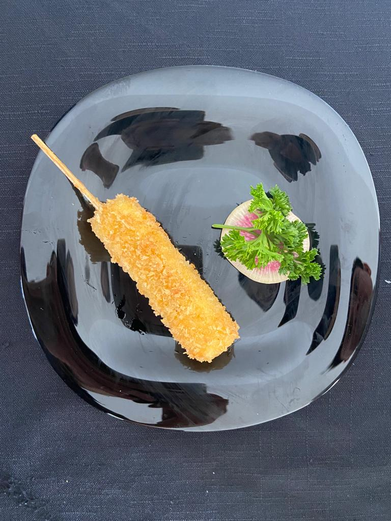Por dentro camarón empanizado y aguacate, por fuera queso crema empanizado y tampico encima.